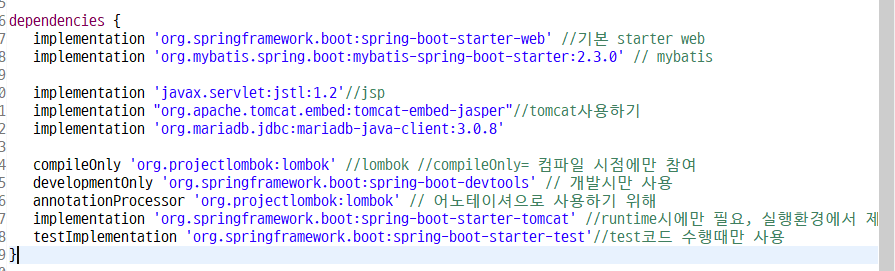 implementation 'org.springframework.boot:spring-boot-starter-tomcat' //runtime시에만 필요, 실행환경에서 제공되는 dependency를 설정