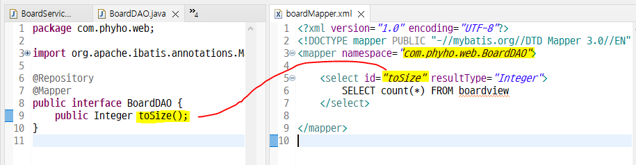 toSize() 메소드 연결해준다. mapper에는 전체글 수 가져오는 쿼리문 작성