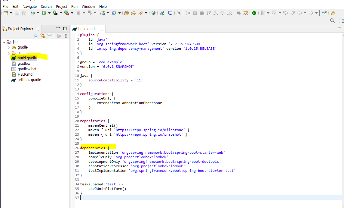 pdf에서 'build.gradle설정=의존성추가하기(jar)' 부분의 코드를 추가해준다.