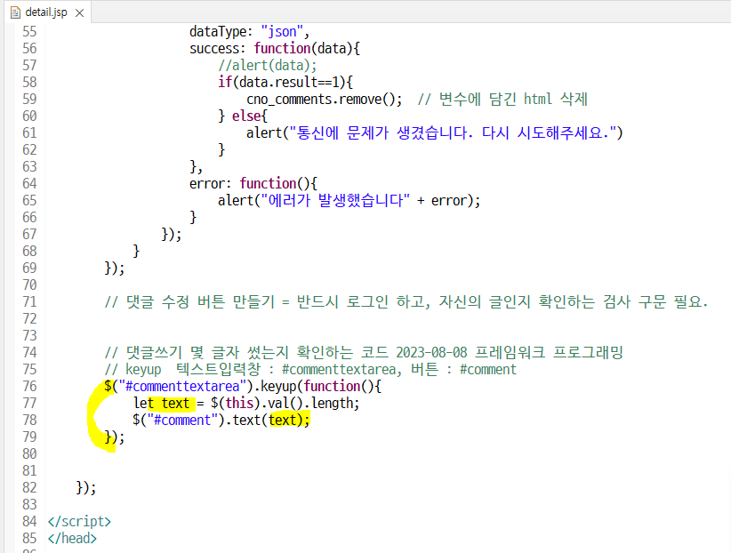 commenttextarea (댓글창) 에 keyup 시 함수 실행되도록 만들어준다.