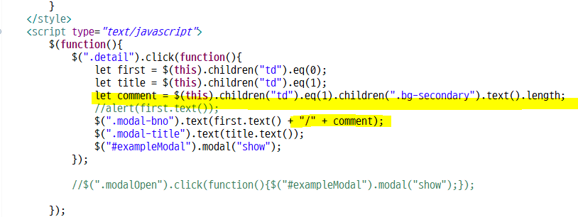 $(.detail).children("td").eq(0).text() => 클릭한 글(tr)의 자식요소(td들)중 첫번째 td의 text값(bno값)