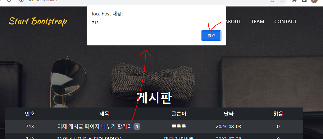이제 글을 클릭하면 해당 글의 bno가 팝업으로 뜨고 (alert실행)