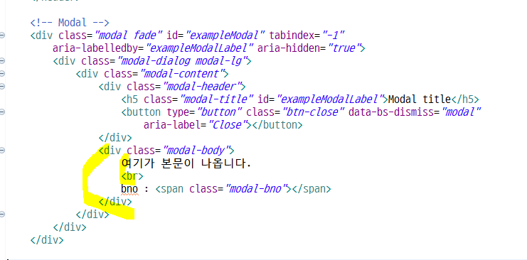bno 값은 span 태그로 정해주고 span의 클래스이름을 modal-bno로 지정해준다.