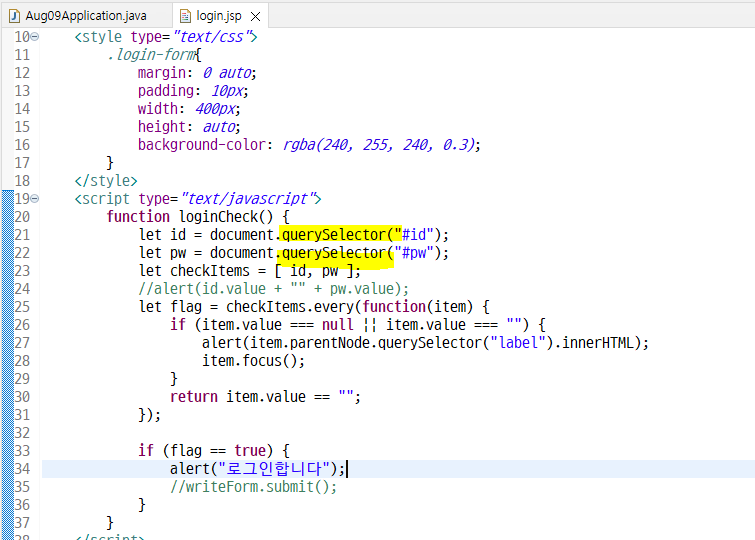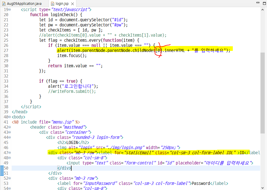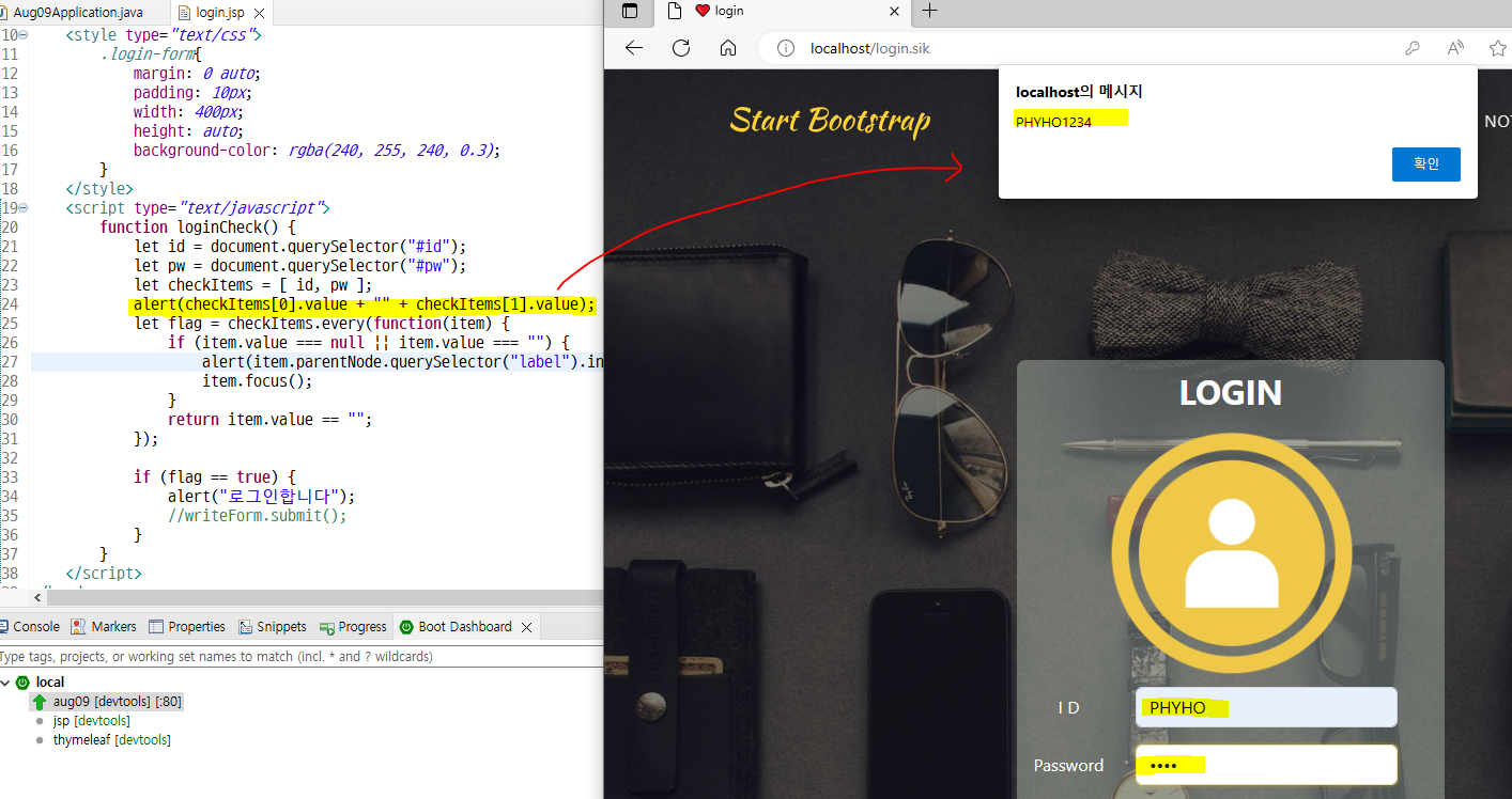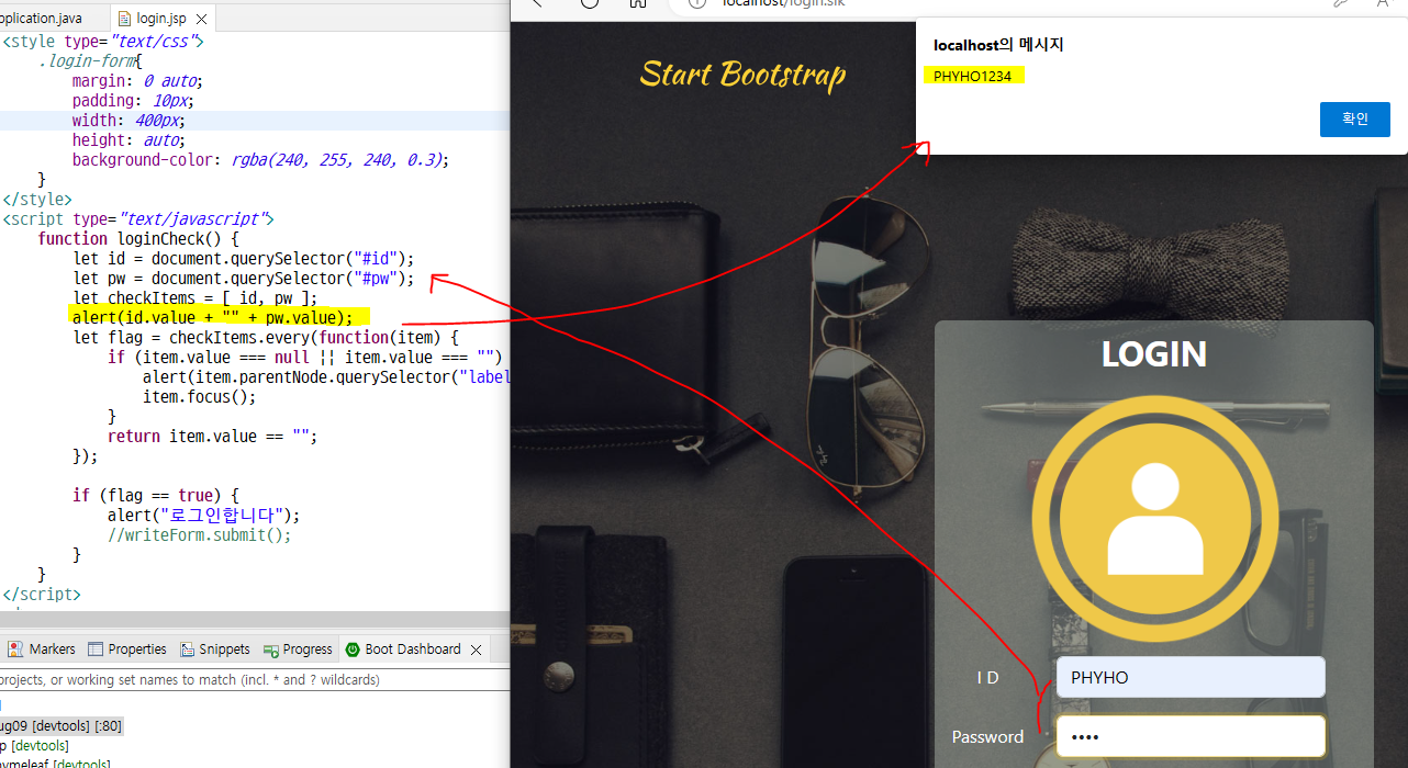 input 창에 입력한 아이디와 비밀번호를 잡아서 id, pw라는 변수에 각각 넣어주고