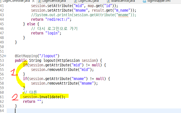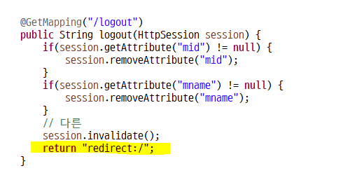 방법1. 세션에서 값(mid, mname)을 뽑아내서 remove