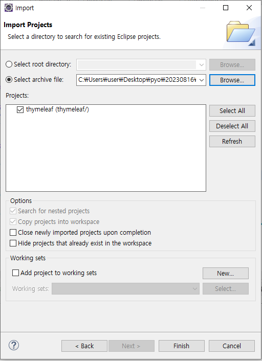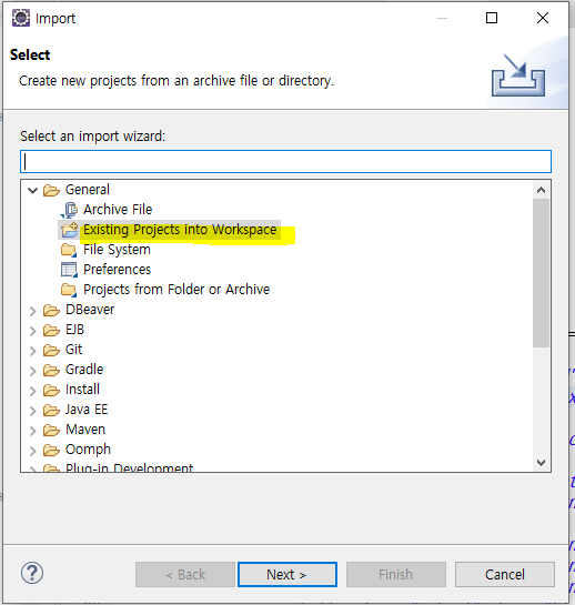 압축파일 넣을때 Import - Existing Projects into Workspace