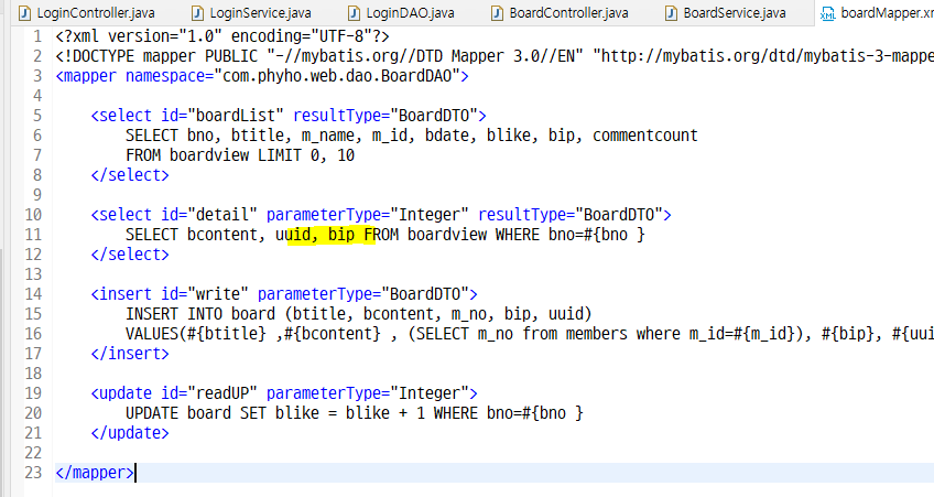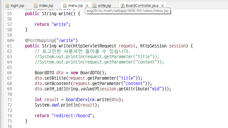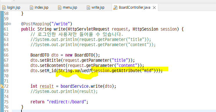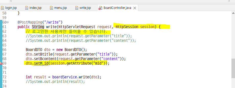 BoardController에서 임시로 넣어줬던 id 대신에 이제 세션에서 가져온 mid를 넣어준다.