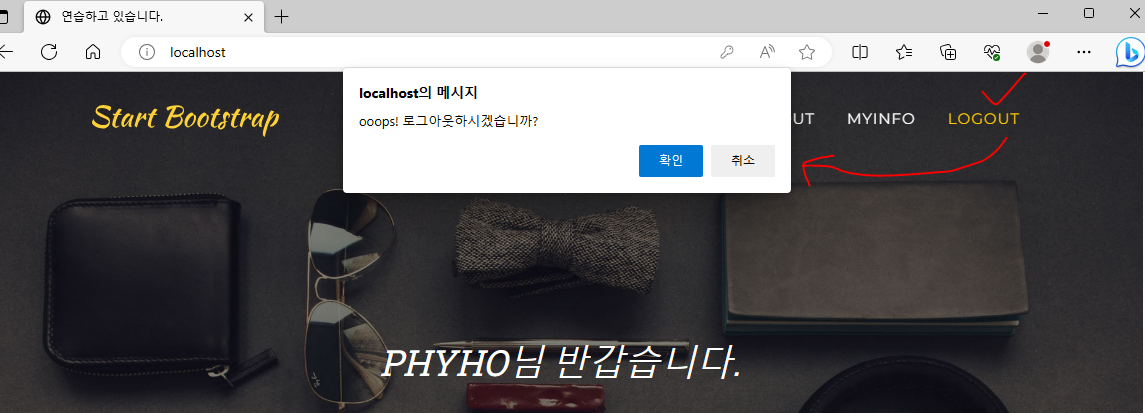 이제 로그아웃을 클릭하면 logout 함수가 실행되면서 팝업창이 뜬다.