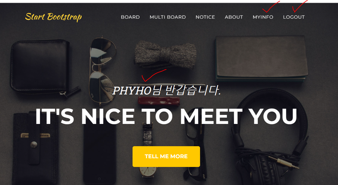 myinfo 메뉴와, logout 메뉴를 추가해줬다.