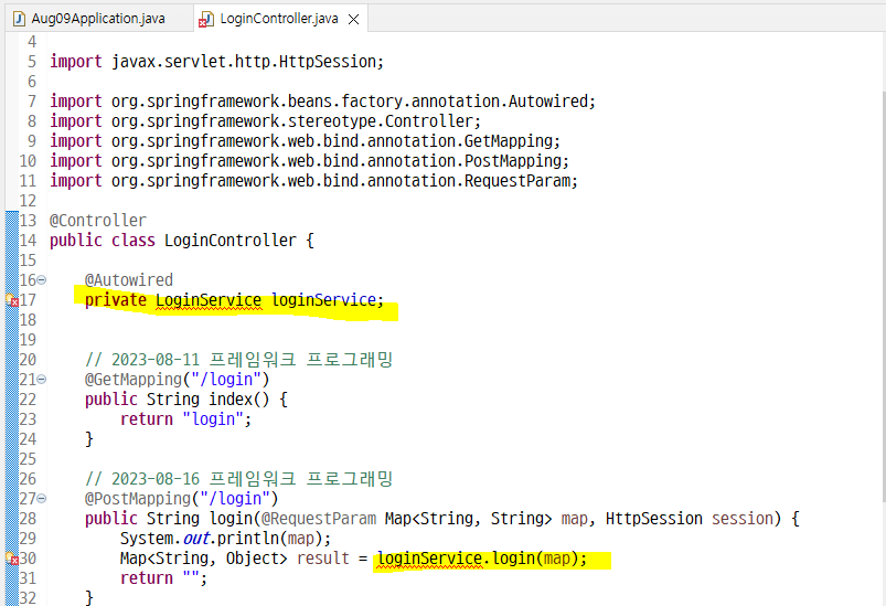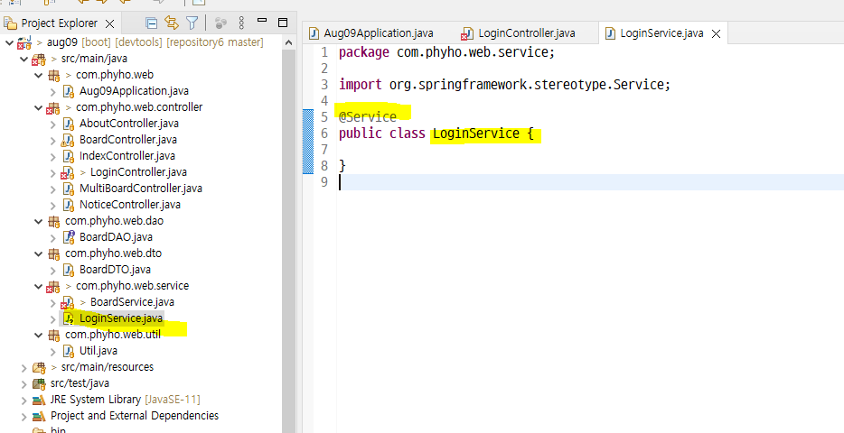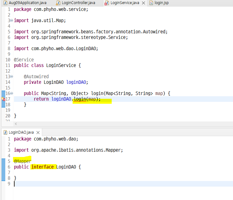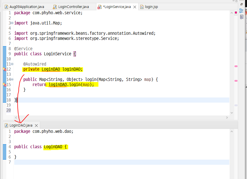 서비스에서 DAO에 일시키고 LoginDAO 생성