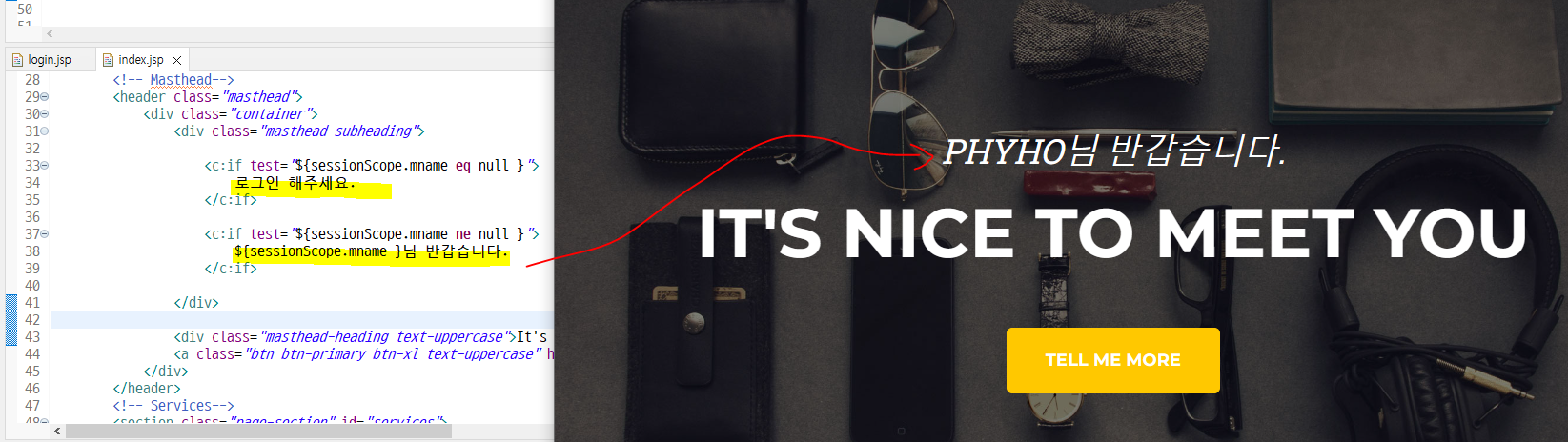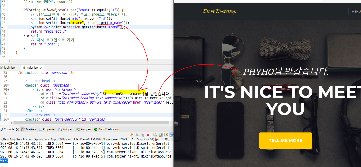 이제 로그인 성공하면 아래 부분에 '(mname)님 반갑습니다' 문구를 띄워보자