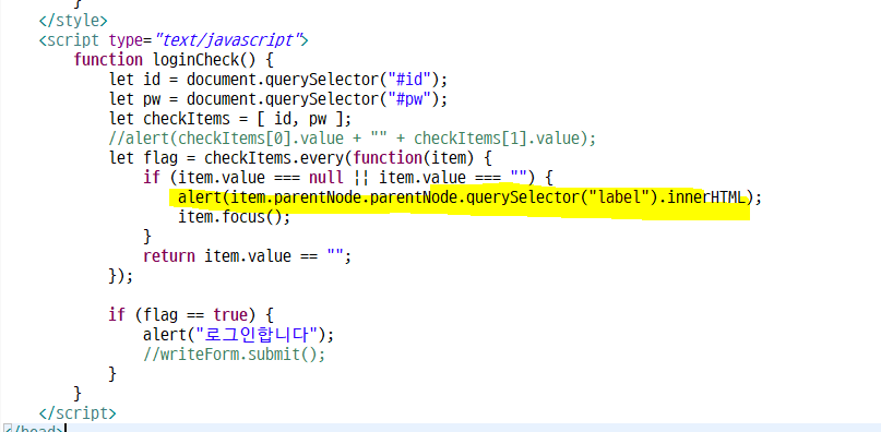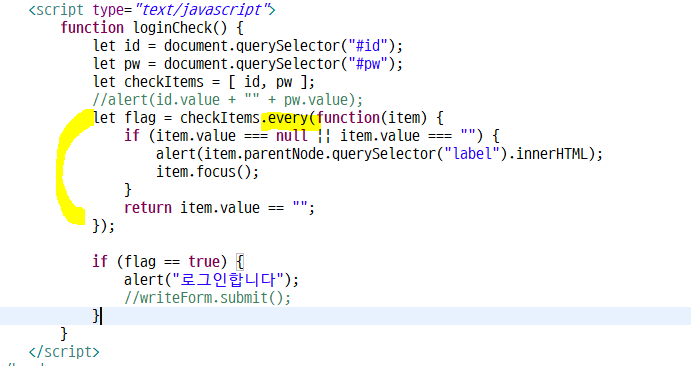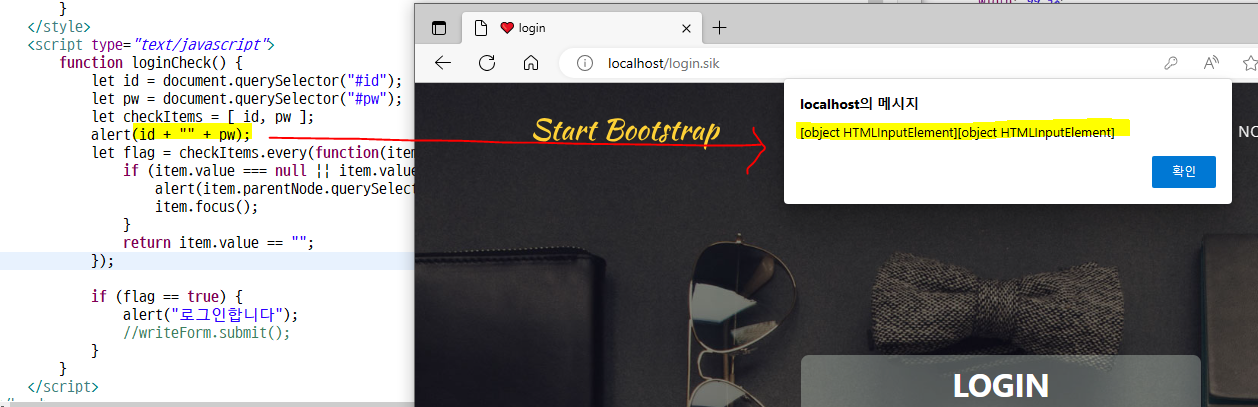 (입력한 값들의 input창(object)를 잡아서 넣어준거라서 id와 pw는 object가 된다.)