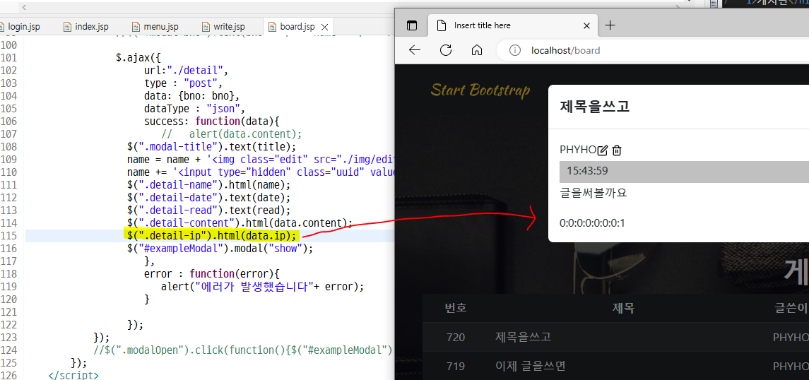 dto에서 ip를 가져와서 json에 넣어주고 이게 리턴되면 detail로 간다. (모달창에 뜨도록)