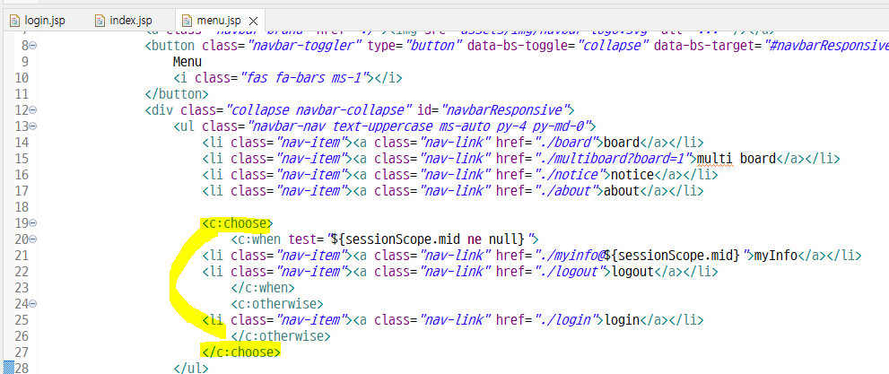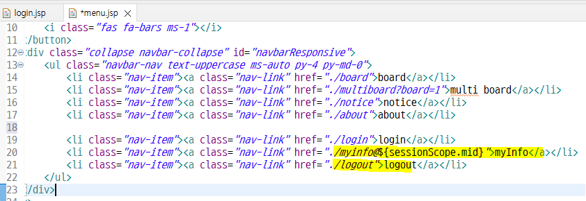 mid가 null 이면(로그인 안했다면) 메뉴바에 myinfo 랑 logout이 뜨고