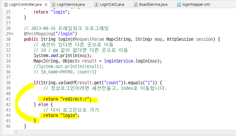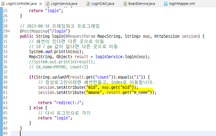id & pw가 일치한다면 세션에 id, name을 각각 mid, mname이라는 이름으로 담아서 메인페이지로 돌아간다.