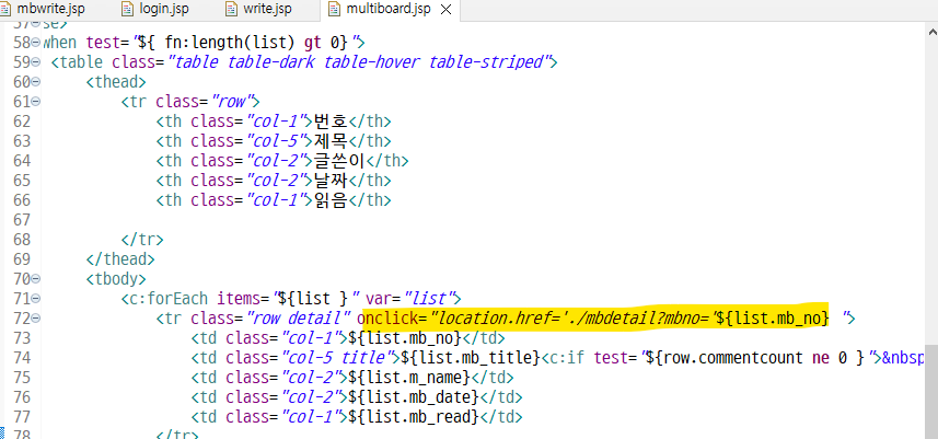 multiboard.jsp 에서 글을 누르면(tr을 누르면) 해당 mbno를 가진채로 detail로 이동하자