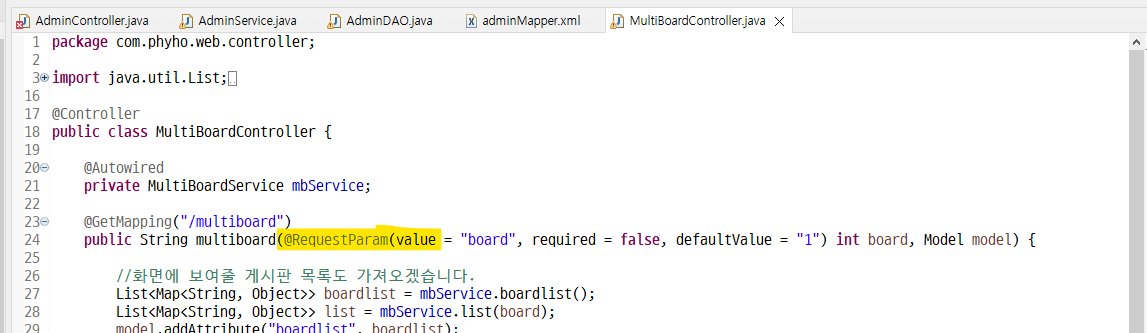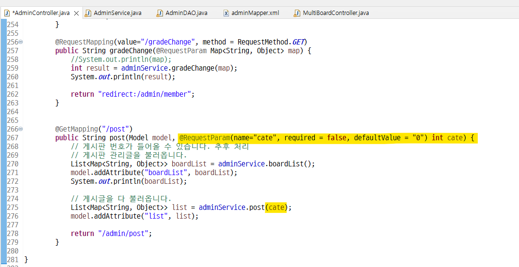 암튼 int타입인 cate를 매개변수로 가져갈거다. (defaultValue는 0으로 설정해줬다_처음 게시글관리를 누르면 cate가 0)