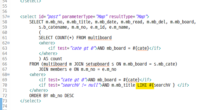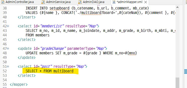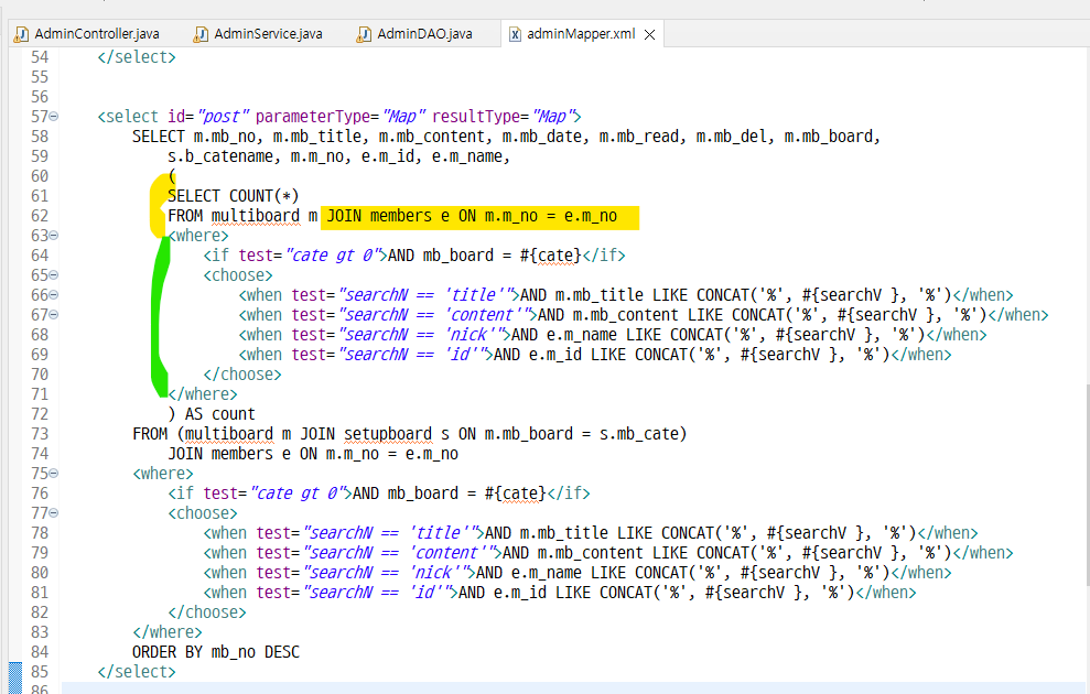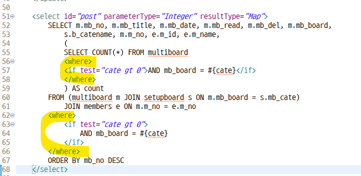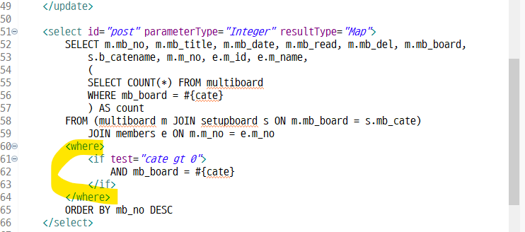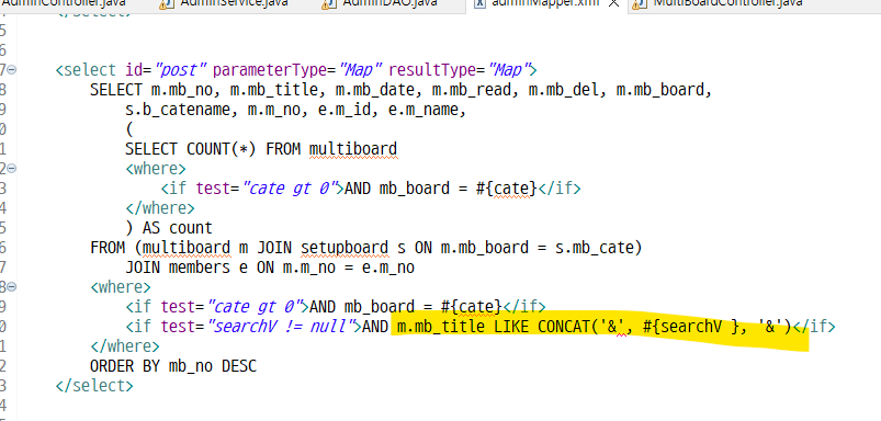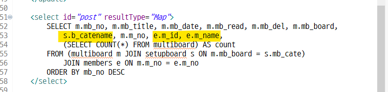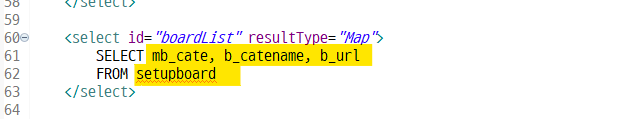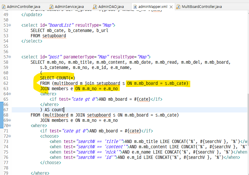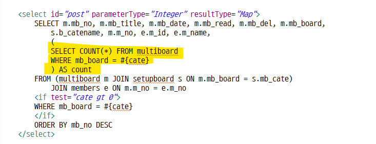 각 게시판 번호에 해당하는 글의 갯수를 가져오려면 mapper에서 count 가져오는 쿼리문을 수정한다.
