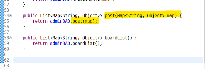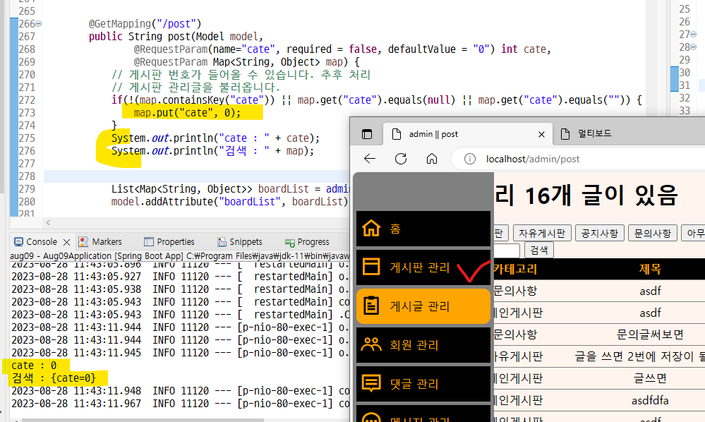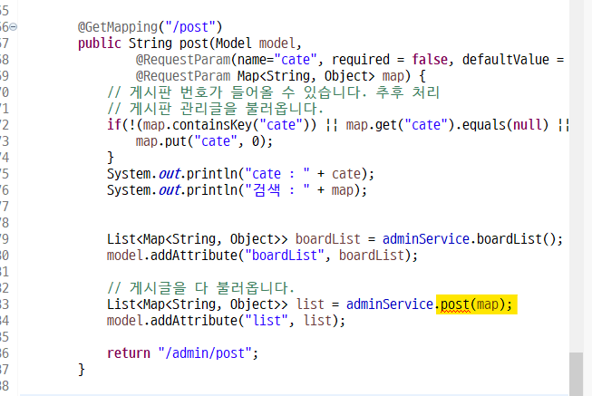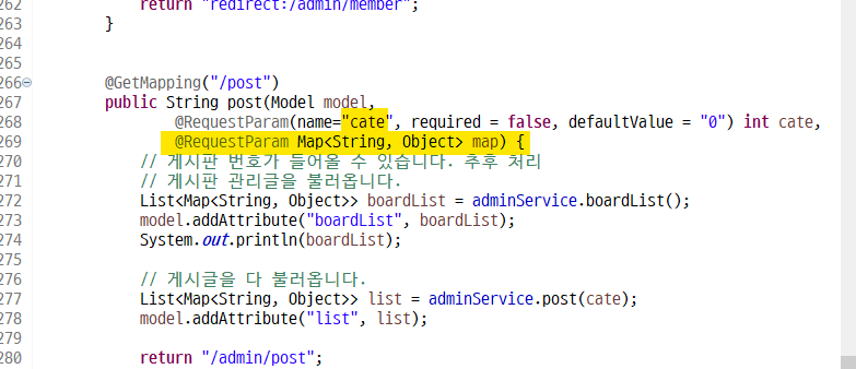 이제 cate를 map에 담았으니 게시글 불러오는 메소드 post() 를 실행할 때 매개변수로 map을 가지고 가자