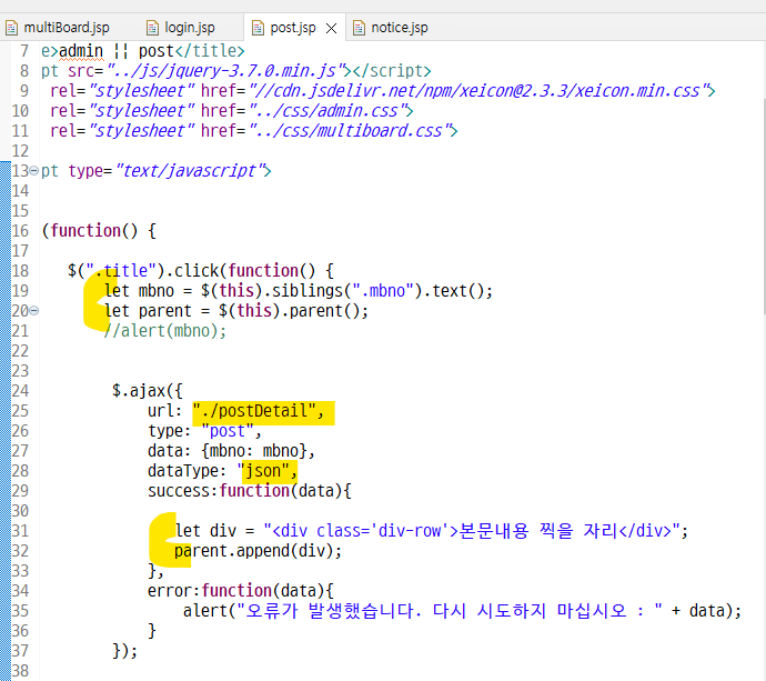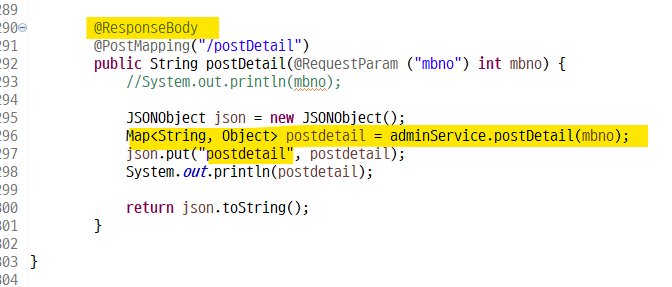 컨트롤러에서 mbno를 잡아 이걸 매개변수로 postDetail 메소드 실행