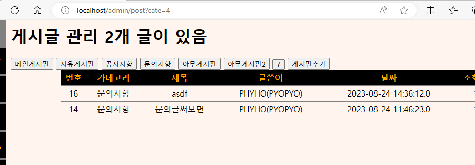 게시글 관리 메뉴를 누르면 (cate=0인 경우)