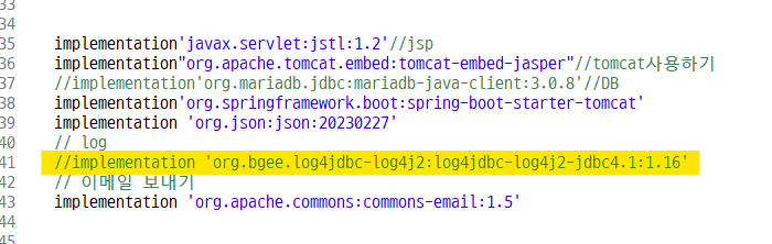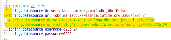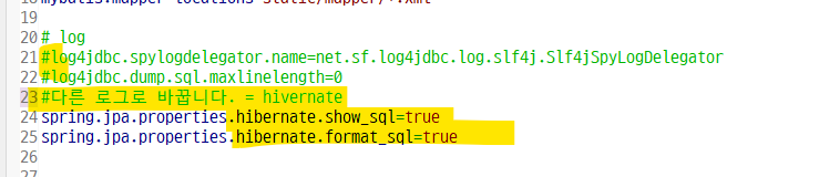 application에 원래있던 log 주석처리하고 hivernate 로 바꿔준다.