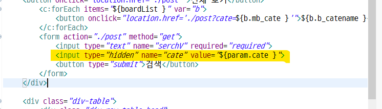 hidden 타입의 input창을 추가해서 form 제출시에 검색창 입력값과 함께 cate (게시판 번호)도 함께 제출할거다.