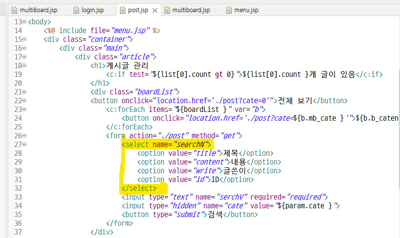 카테고리 선택하고 검색내용 입력 후에 검색 버튼 눌러보면