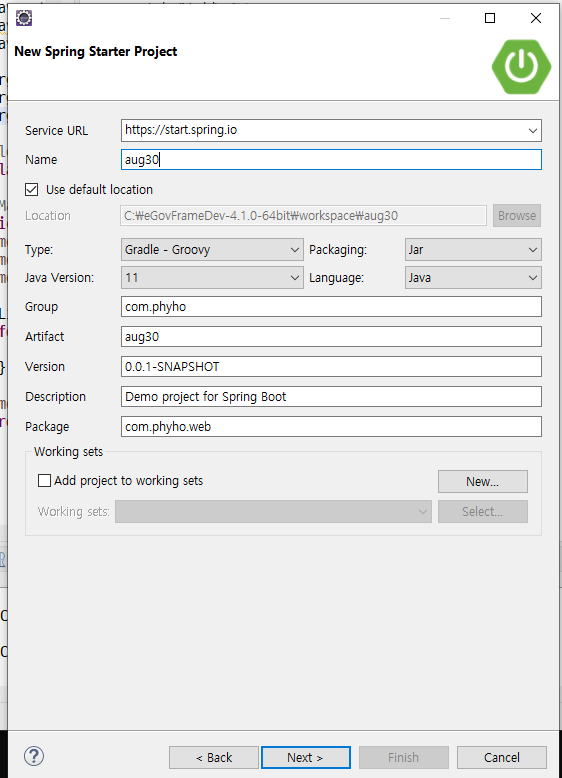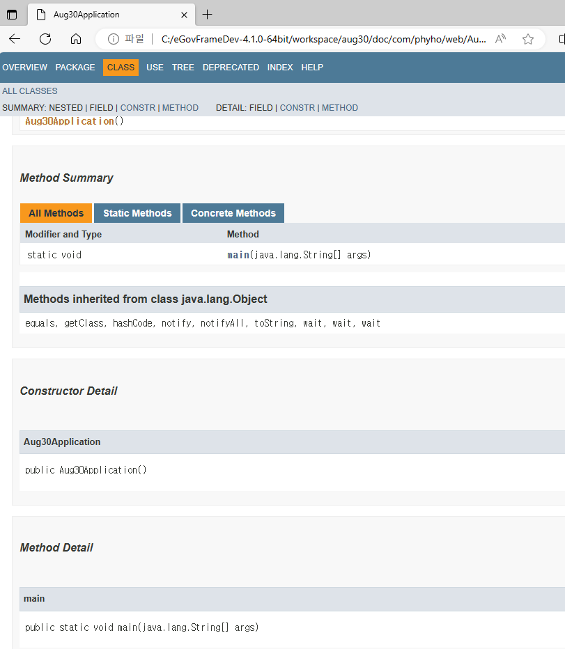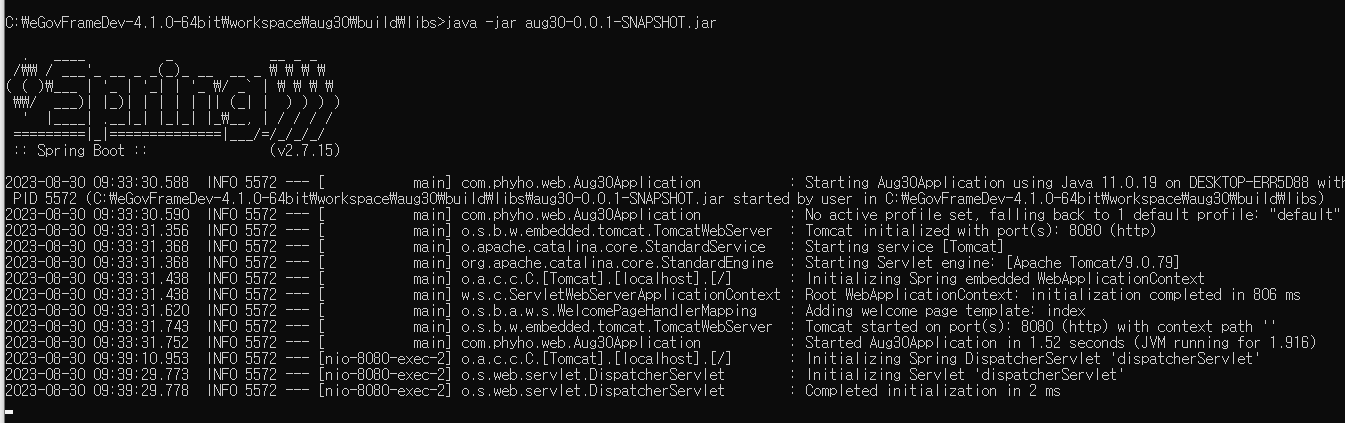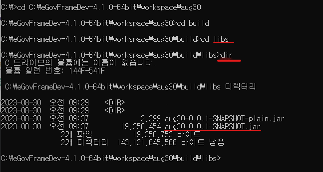 C:\eGovFrameDev-4.1.0-64bit\workspace\aug30\build\libs 아래에 jar 파일이 생성된다.