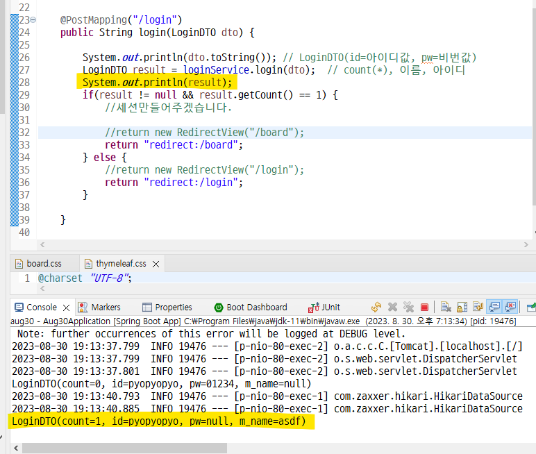 컨트롤러에서 result값 출력 잘되는지 확인하고
