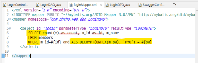 members 테이블에서 html페이지에서 입력한 id & pw와 일치하는 조건 검사후