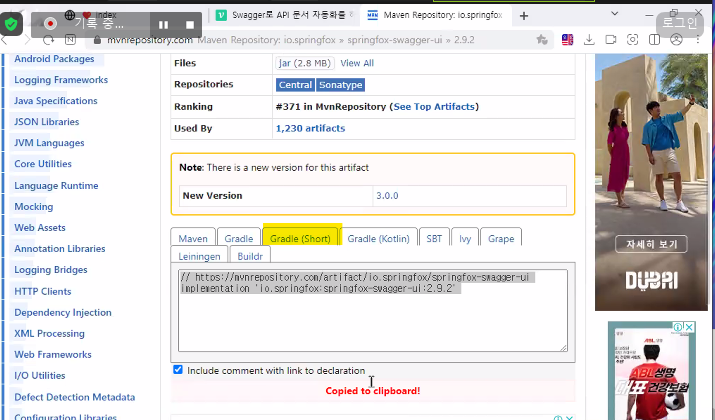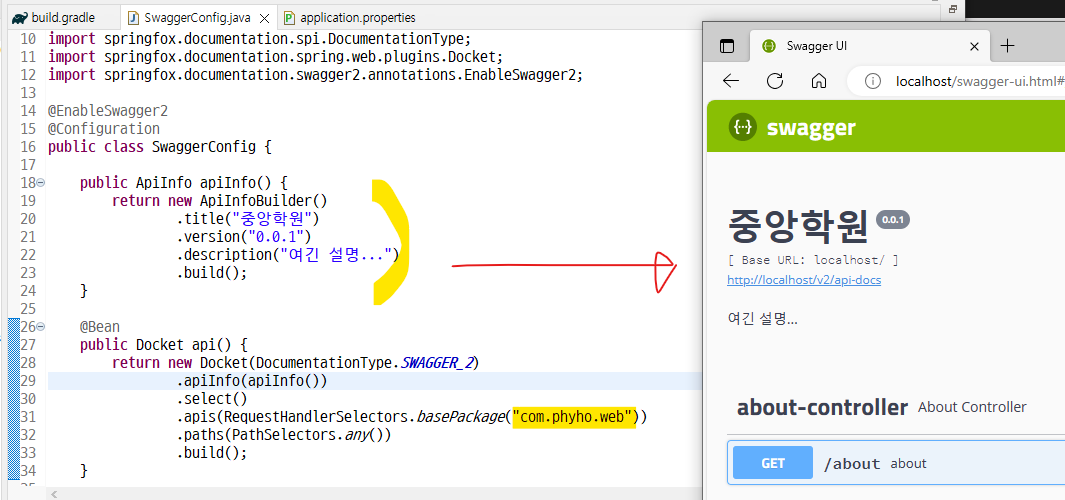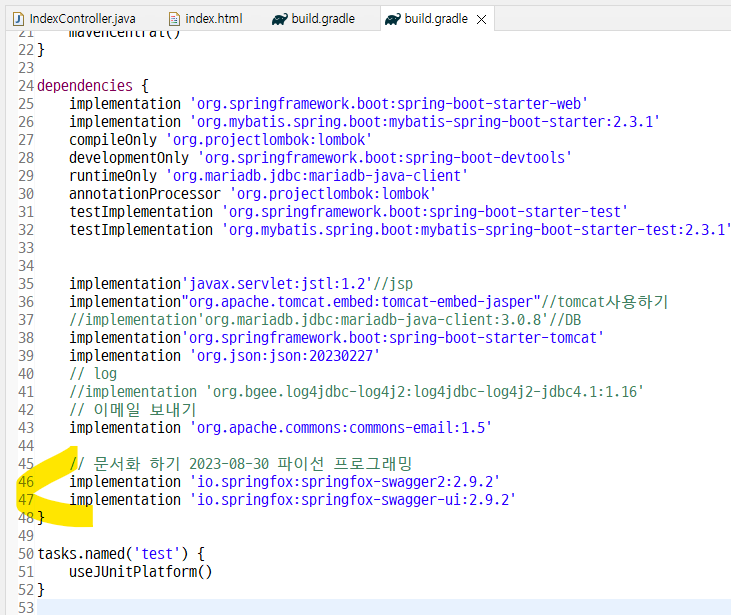 aug09 프로젝트의 build.gradle에 넣어준다. (문서화 했을때 보여질게 많아서 이 프로젝트에 넣어줬다.)