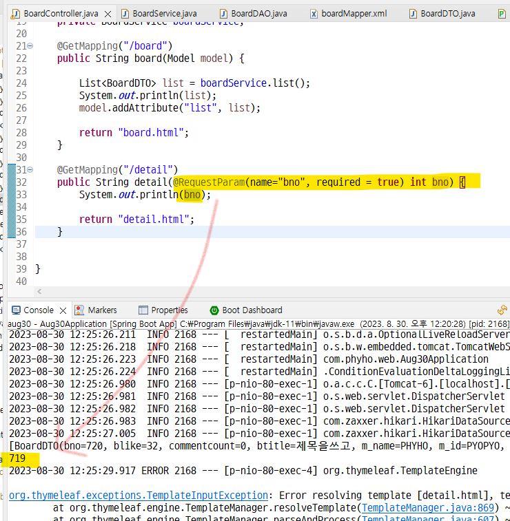 720번 글을 클릭하면 bno를 잘잡아온다.