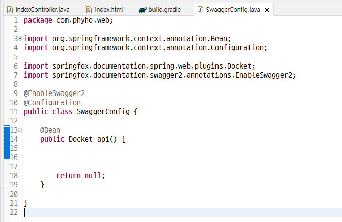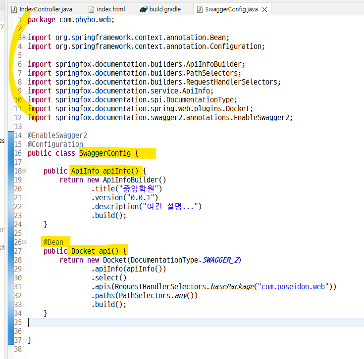SwaggerConfig 클래스 생성 & 어노테이션 해준다.
