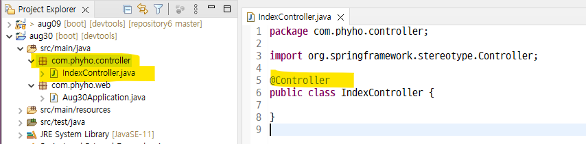 패키지명 다시 com.phyho.web으로 수정해줬다.