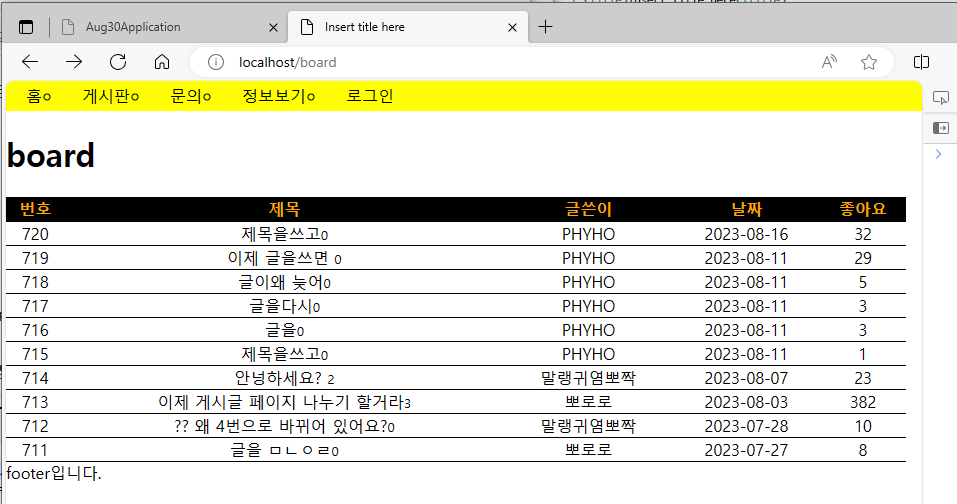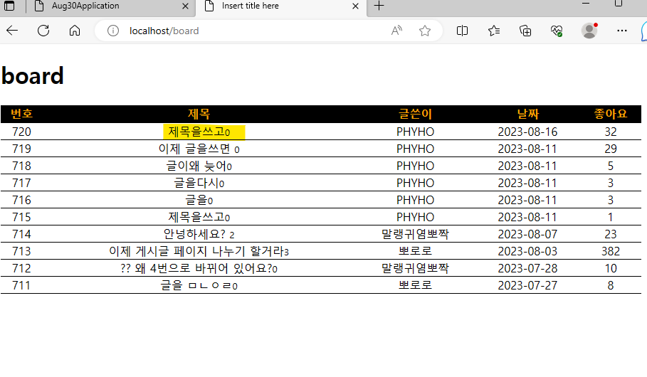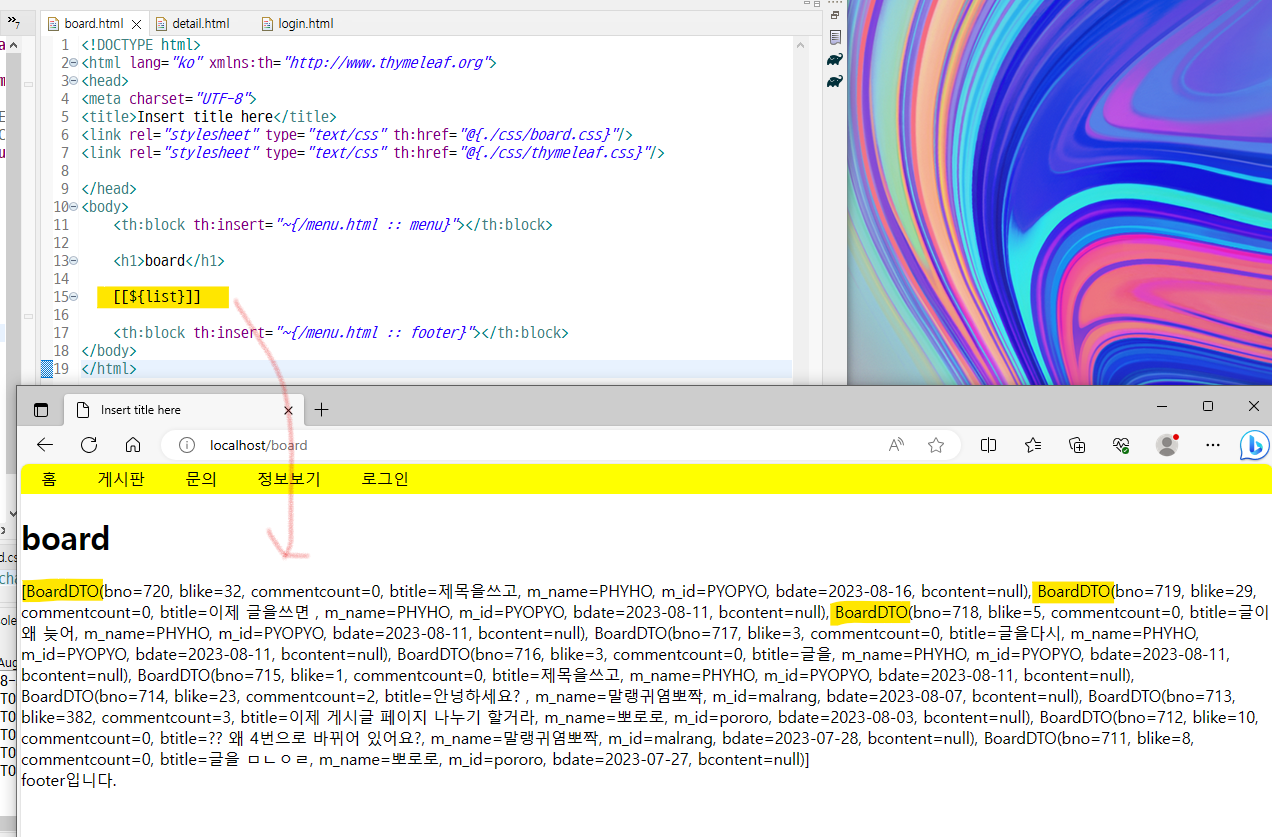 컨트롤러에서 list로 보낸값을 board.html에서 출력해보면