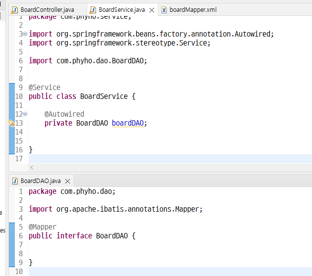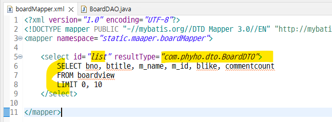 위에 설정넣어준대로 static 폴더 아래에 mapper 폴더 만들고 아래에 boardMapper.xml 파일 생성