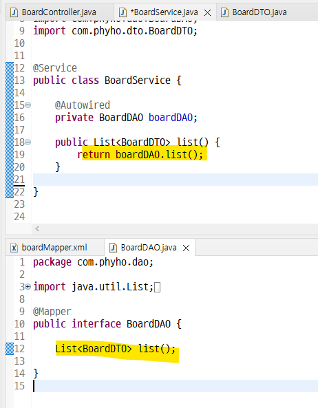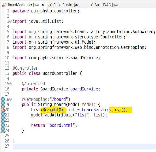 컨트롤러에 BoardDTO 타입인 list 생성해준다.
