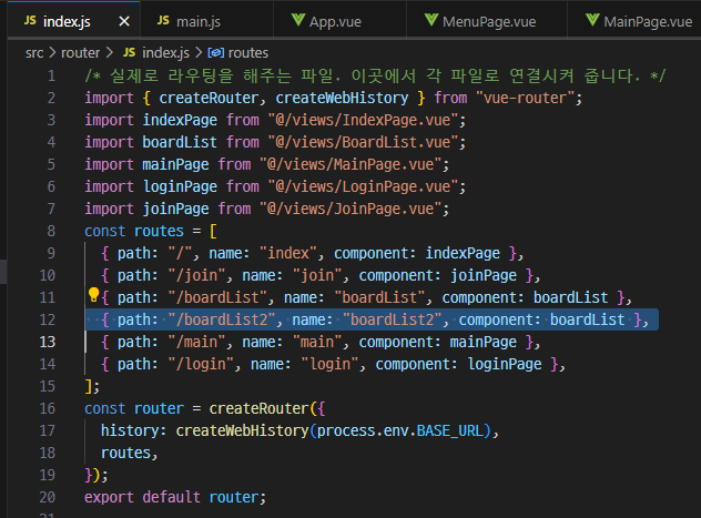 * 서로 다른페이지(서로 다른 vue 파일)로 이동하는 기능을 router폴더의 js파일에 만들어줄 예정