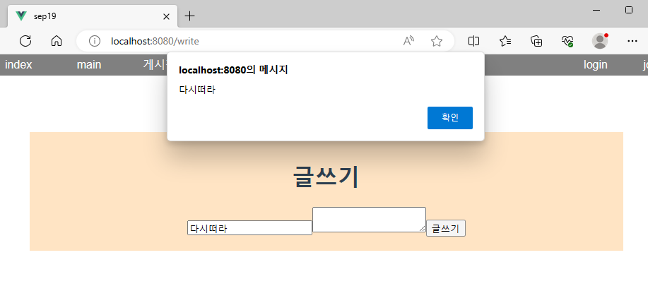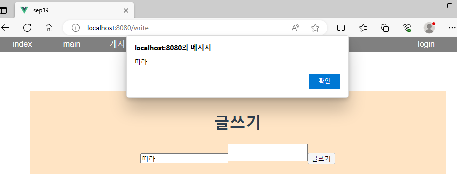 제목을 쓰고 글쓰기 버튼을 눌러보면 아래처럼 title의 값을 잘 잡아와 팝업으로 띄운다.