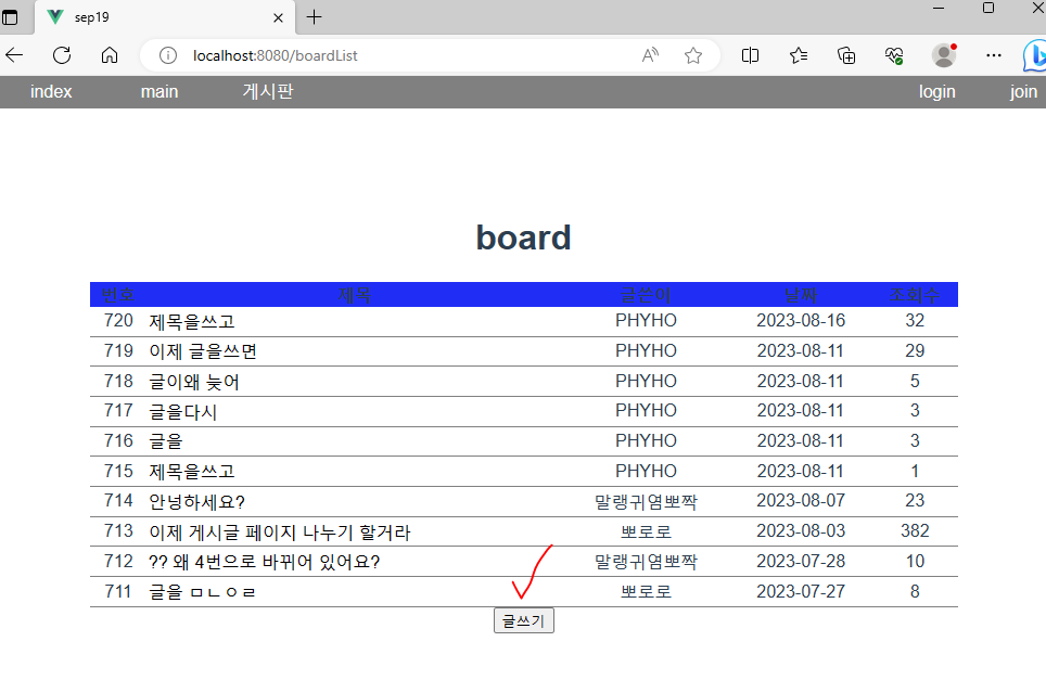 글을써보면 잘 저장되면서 글저장 팝업이 뜨고 boardList 페이지로 이동한다.