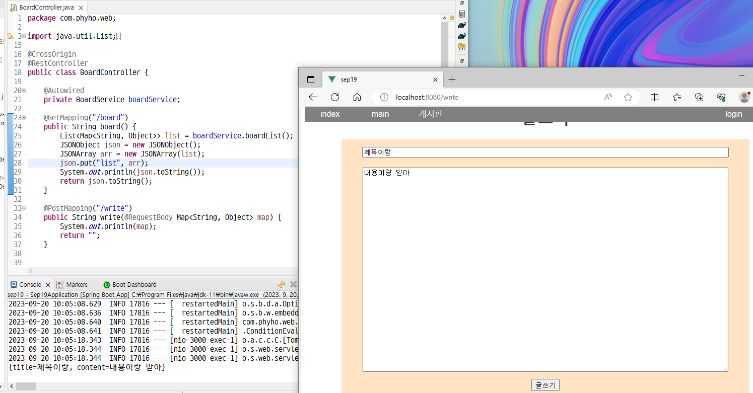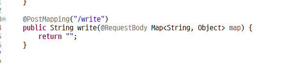 글을쓰고 글쓰기 버튼을 누르면 서버에서 잘 받아서 map값이 뜬다.