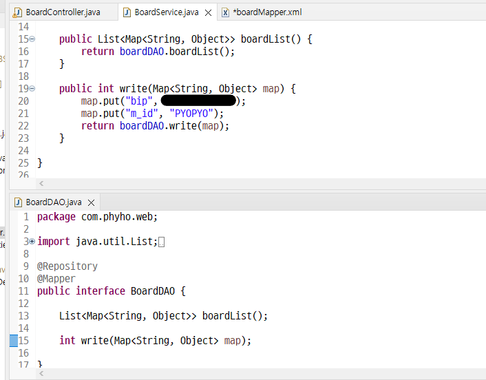 map 에 bip, m_id값을 넣어서 DAO로 보낸다.