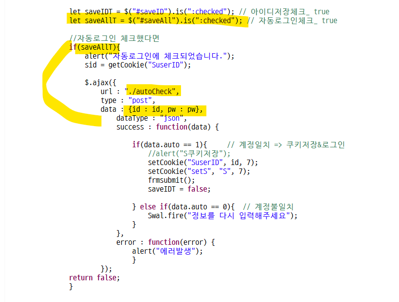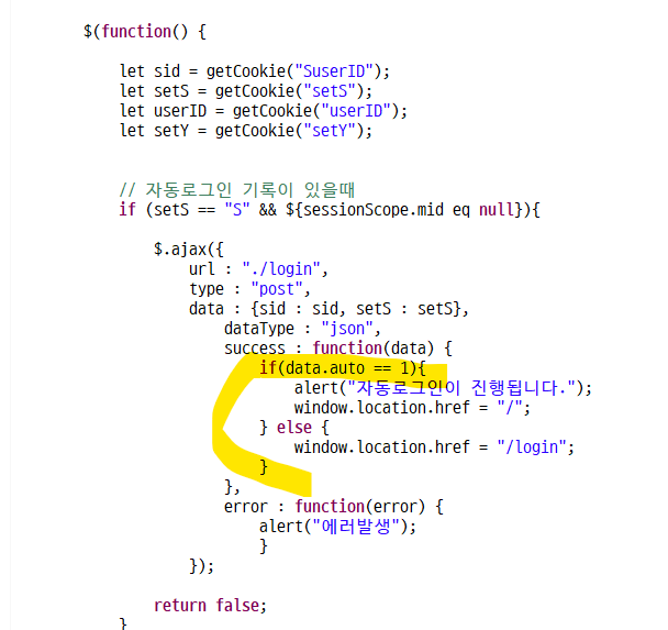 if(data.auto == 1){ // 계정일치 => 쿠키저장&로그인