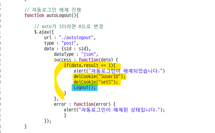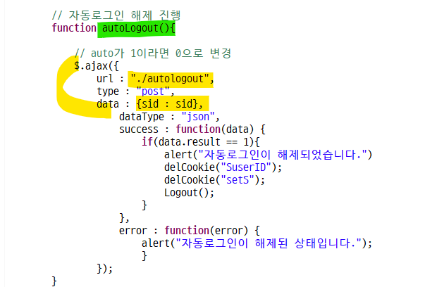 autoLogout 함수가 실행되면 sid를 매개변수로 컨트롤러에 /autologout 요청을 보낸다.