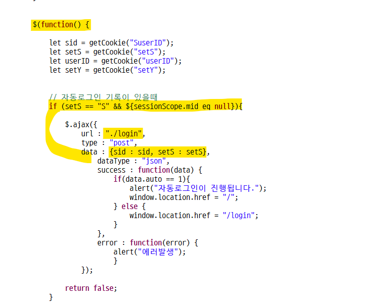 아래의 함수의 조건문에 걸려서 sid & setS 값을 매개변수로 서버에 /login요청을 전송.