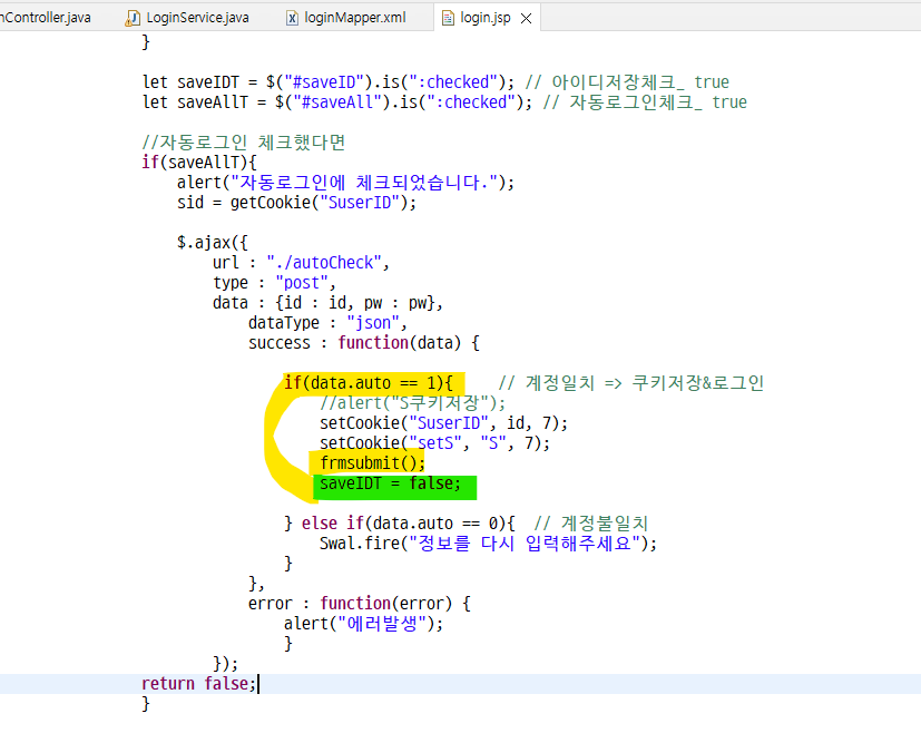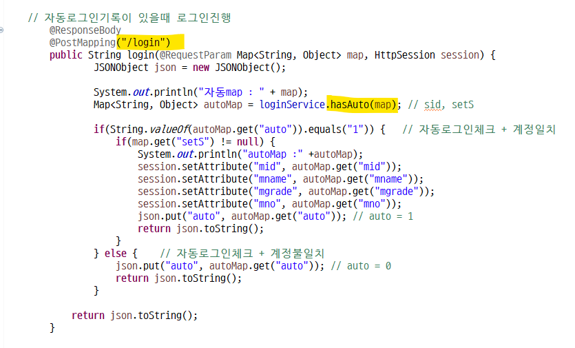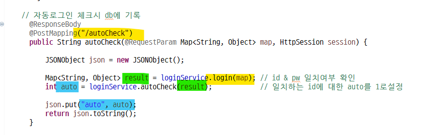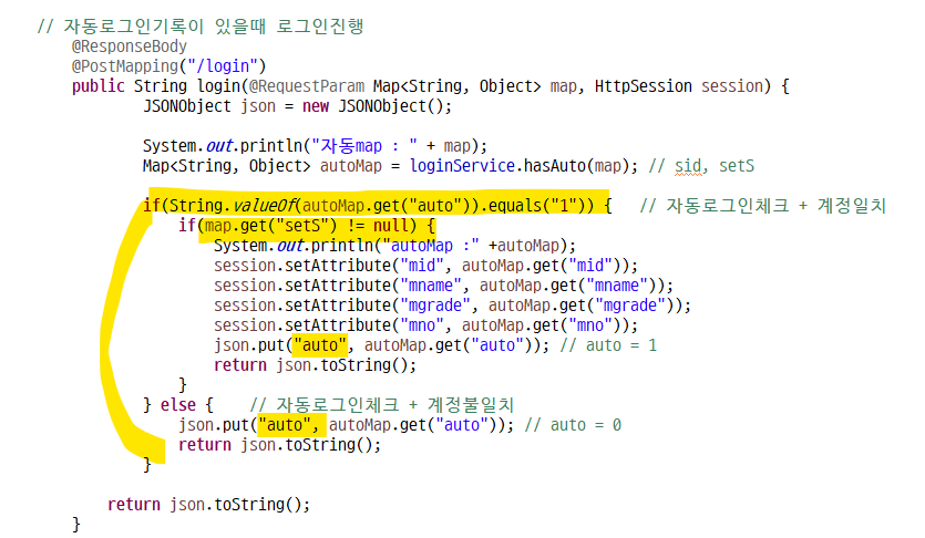 auto값이 1이면서 setS값이 존재한다면, session에 값들을 담아 로그인 처리 후 json에 1을 담아 보내고,