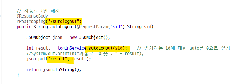 컨트롤러에서는 sid를 매개변수로 autoLogout 메소드 실행