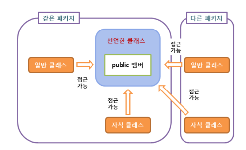 해당 클래스 멤버는 외부로 공개되며, 해당 객체를 사용하는 프로그램 어디에서나 직접 접근 가능.