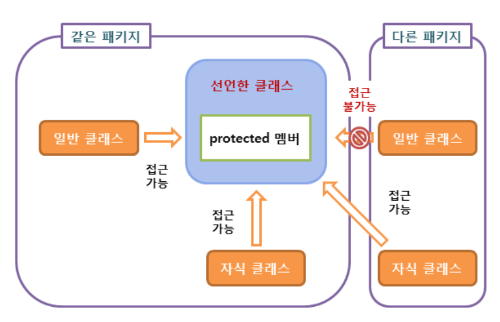 같은 클래스 멤버 / 같은 패키지 멤버 / 상속받은 자식 클래스(child class) 멤버만 접근 가능.